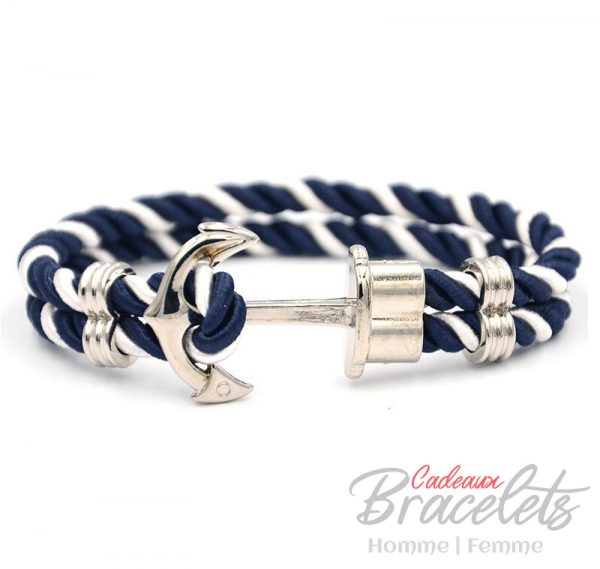 Bracelet Ancre platiné Nylon bleu et blanc.