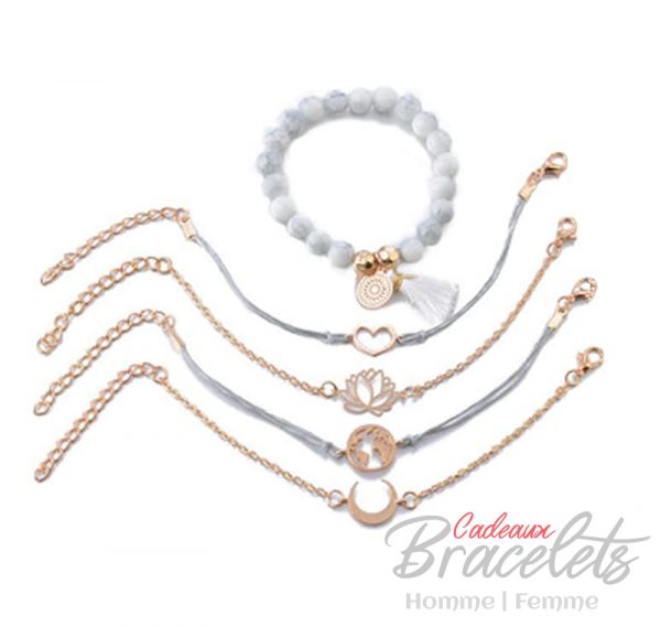 Ce lot se compose de 5 bracelets avec monde, cœur et lune.