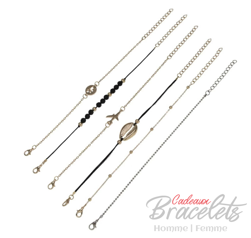 Ce lot se compose de 5 bracelets avec avion, coquillage et monde