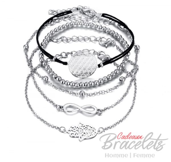 Ce lot de 5 bracelets se compose de 5 bracelets avec un pendentif « khmissa » et « infini » en métal.