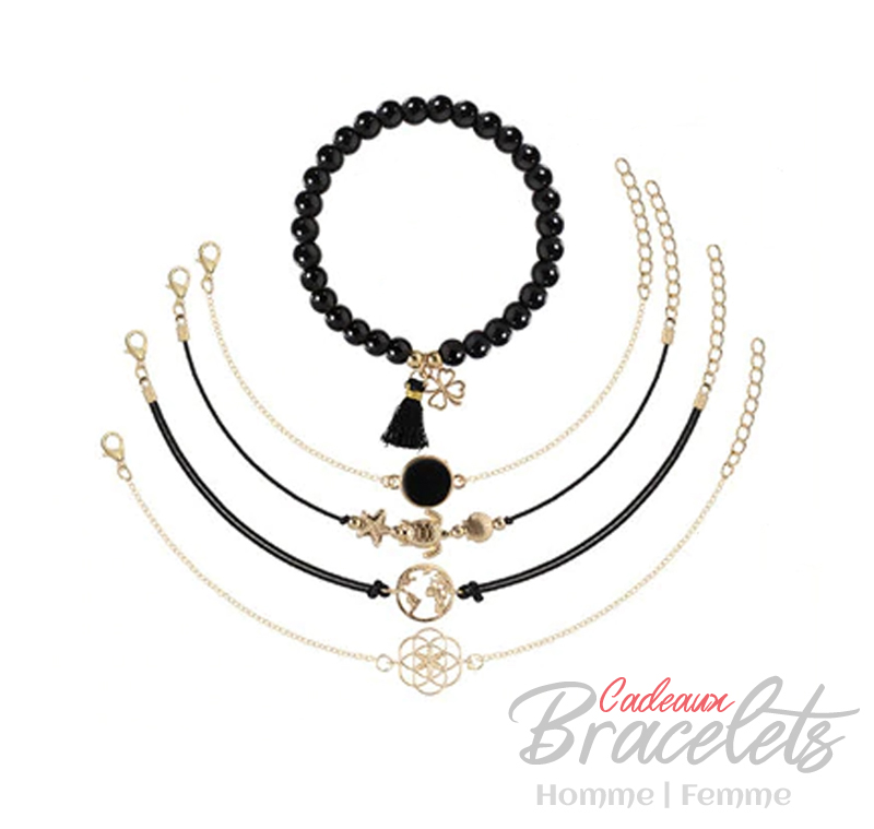 Ce lot se compose de 5 bracelets avec monde, étoile et tortue.